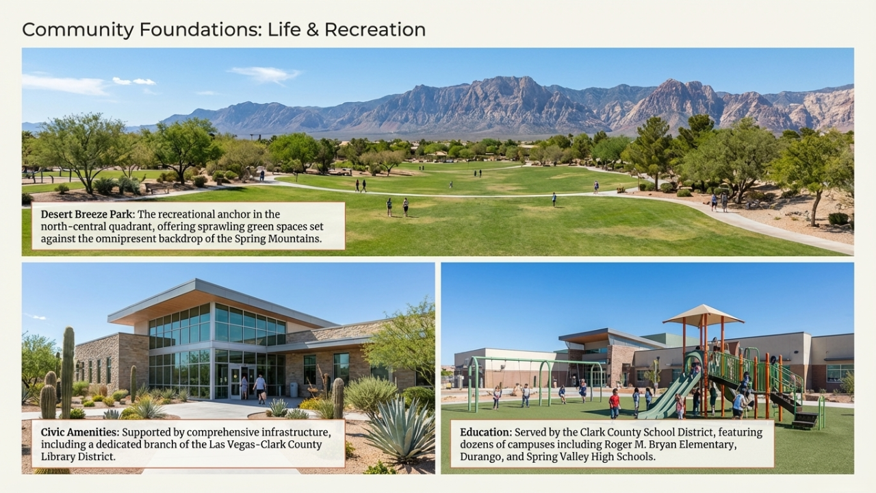 Summerlin offers over 200 miles of trails, more than 300 parks, 10 golf courses, and direct access to Red Rock Canyon for hiking, biking, climbing, and scenic drives.